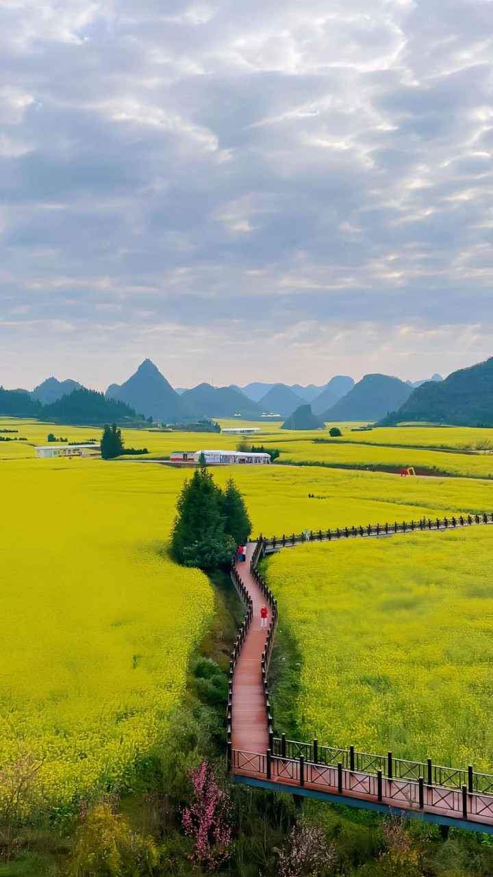 自后才知谈,罗平的油菜花是出了名的。不是因为它多,是因为它长得极度——种在喀斯专门貌的山包之间。那些圆圆的山包,一个个从花海里冒出来,像强劲的馒头,像绿色的蘑菇,像童话里才有的东西。花是黄的,山是绿的,天是蓝的,三种形式铺在沿路,简便得不像确切,可它偏巧是确切。