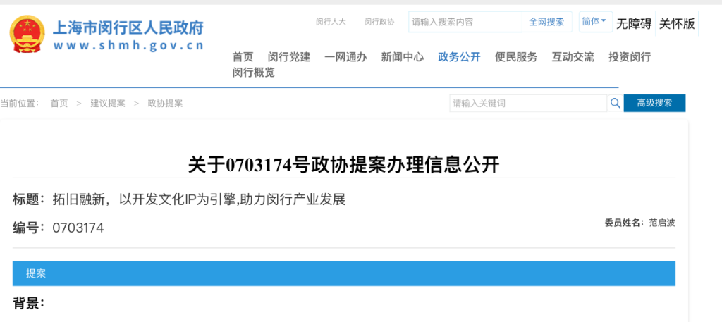 上海市闵行区政府在给范启波委员的政协提案《拓旧融新,以诱骗文化IP为引擎,助力闵行产业发展》进行办理的公开信息。网站截图