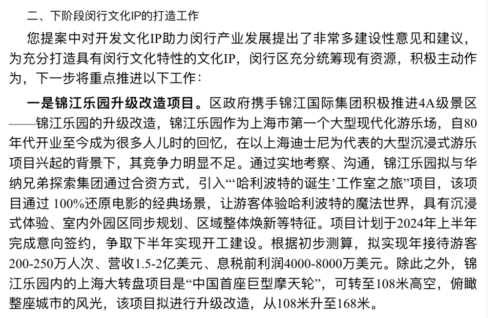 滂沱新闻(www.thepaper.cn)记者能干到,2024年2月18日,上海市闵行区政府在给范启波委员的政协提案《拓旧融新,以诱骗文化IP为引擎,助力闵行产业发展》进行办理的公开信息中提到:下阶段闵行文化IP的打造责任,包括锦江乐土升级校正式样。闵行区政府联袂锦江外洋集团积极鞭策4A级景区——锦江乐土的升级校正。