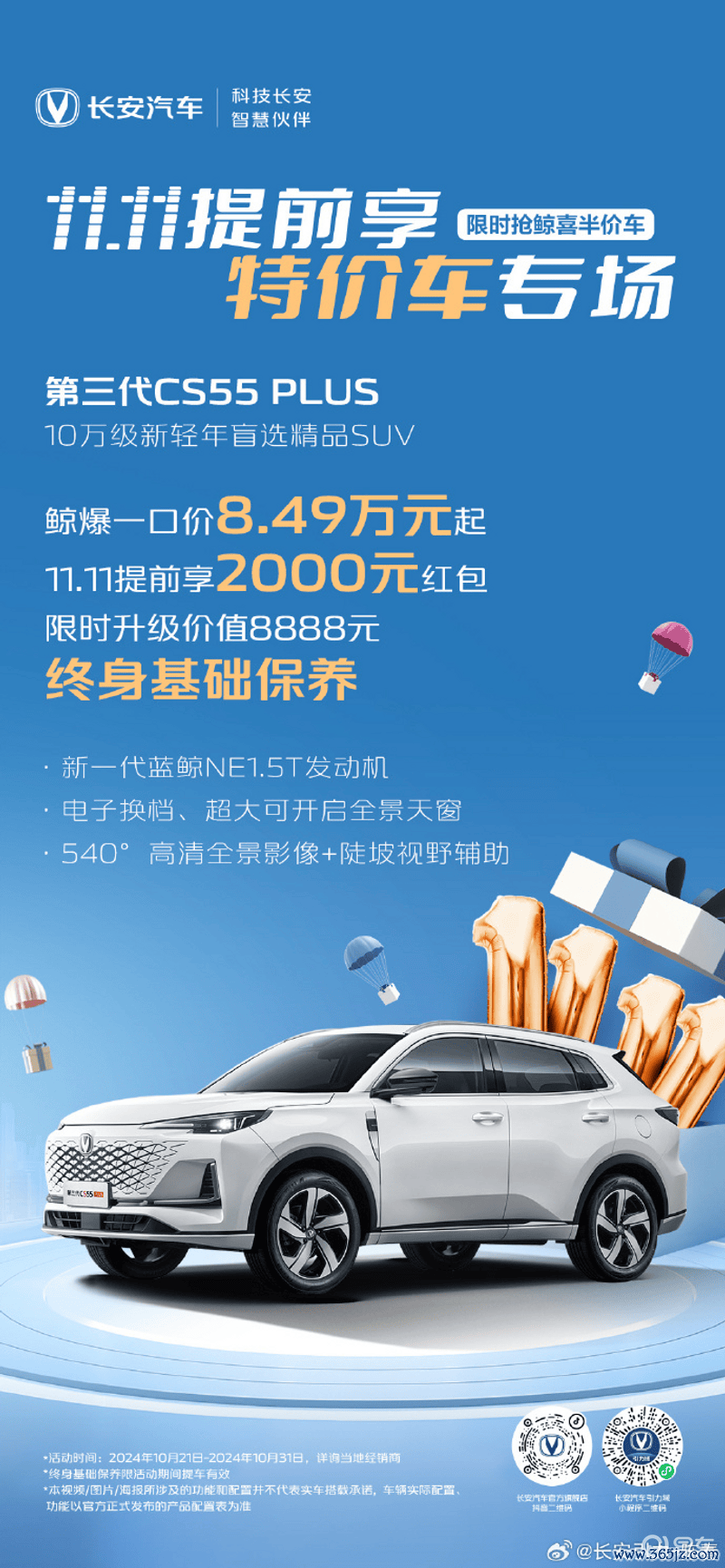 第三代CS55PLUS可享受,鲸爆一口价8.49万元起,11.11提前享2000元红包,以及限时升级价值8888元终生基础诊疗。