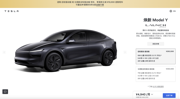 1月10日,焕新版Model Y厚爱登陆特斯拉中国官网,同期上线首发版车型,预售价26.35万元起,新车在外不雅、座舱、续航等方面迎来了不同经由的升级。
