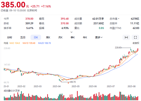 中际旭创的股价自2025年4月中旬以来涨幅权贵。9月4日曾一度涉及本年最高点448元/股;9月3日总市值4735.48亿元,进步东方钞票(300059.SZ),位列创业板第二,仅次于宁德期间(30075.SZ)。在交易两边互呛之后,中际旭创股价在9月8日、9日接续两天跳水,但10日复原高涨最终收盘385元/股,年内股价翻了2倍多。
