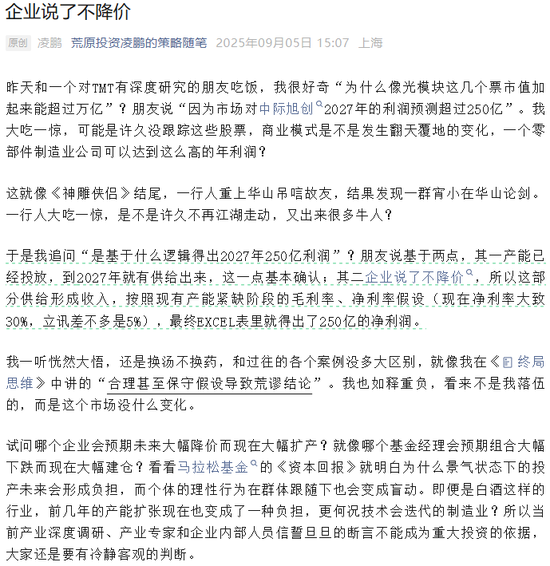9月5日,私募基金机构荒漠投资董事长、实控东谈主凌鹏在公众号发了一篇名为《企业说了不降价》的著作,对“市集对中际旭创2027年的利润预测进步250亿”产生质疑。