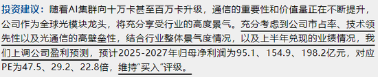 值得瞩主义是,9月7日,国盛证券通讯宋嘉吉团队发表了一篇对中际旭创功绩点评的讲演:跟着AI集群向十万卡以致百万卡升级,通讯的进军性和价值量正在不停晋升,公司行动全球光模块龙头,将充共享受行业的高度景气。保管中际旭创“买入”评级,上调公司盈利预测,瞻望2025-2027年归母净利润为95.1、154.9、198.2亿元。而4月份其对中际旭创2027年的利润预测为125.1亿元,5个月后上调了73亿元。