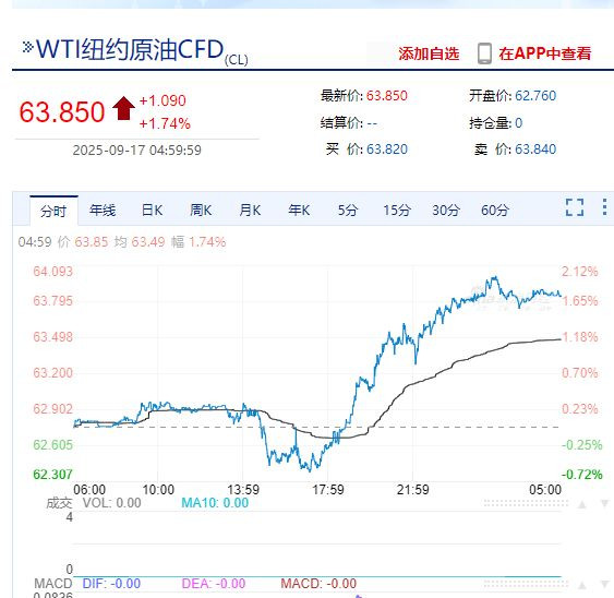 WTI纽约原油涨1.74%、布伦特原油涨1.59%。