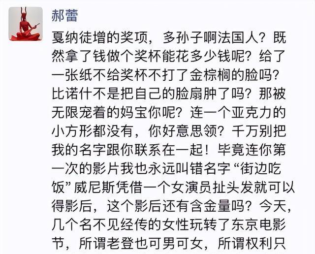但是荣誉背后,是质疑的声息。一张疑似郝蕾一又友圈的截图夙昔流传,以“女演员扯头发就不错得影后”的讽刺,将辛芷蕾推到了风口浪尖。