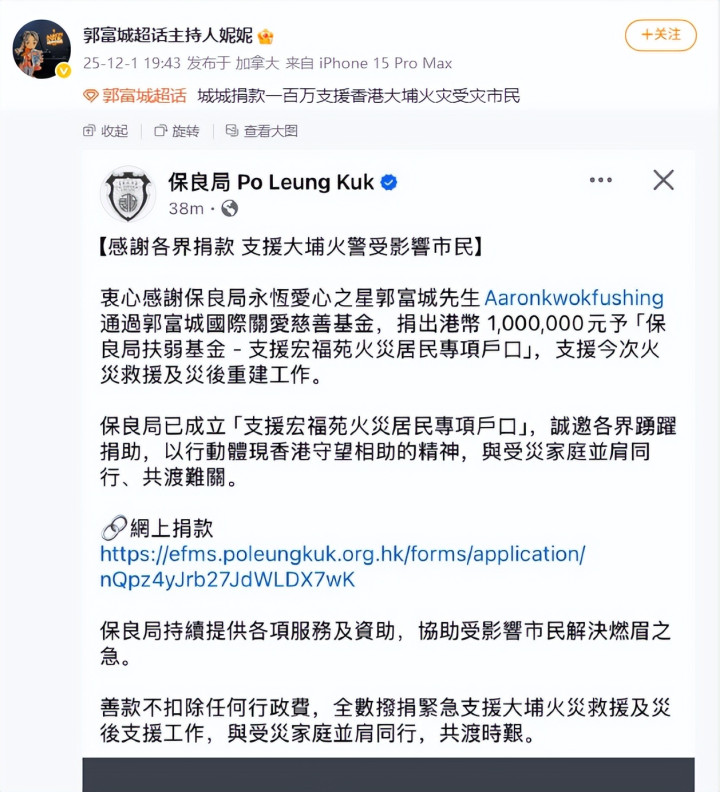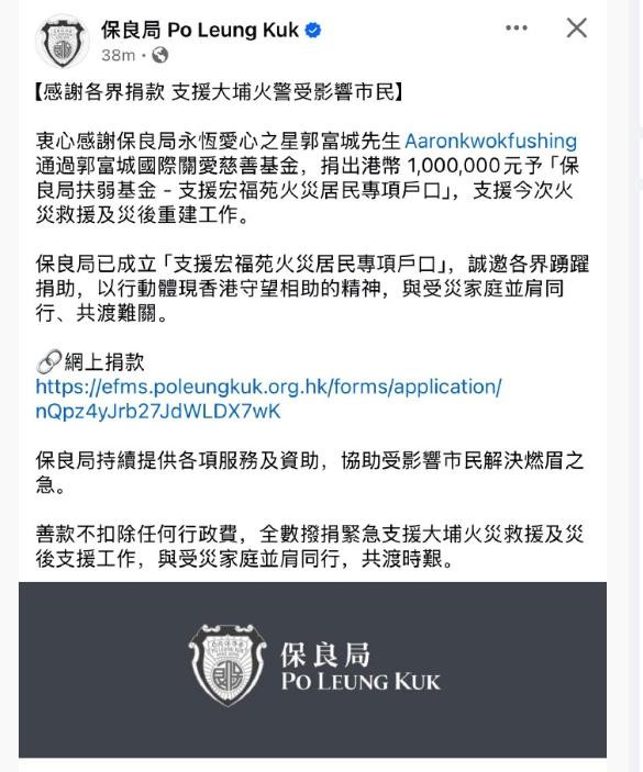 香港保良局发文,公布了郭富城通过个东谈主慈善基金捐钱100万港元。