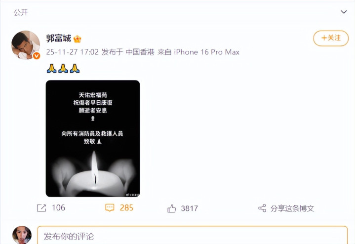 但是,失火发生后,郭富城立即在搪塞平台上,向支撑者致意,也祝愿受难者能够安息。