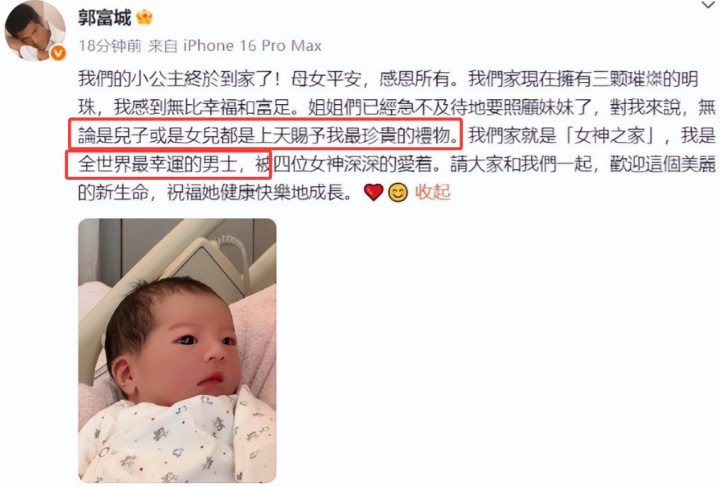 从郭富城的字里行间,咱们能感受到他对这个重生命的瞩目和对家庭的爱戴。
