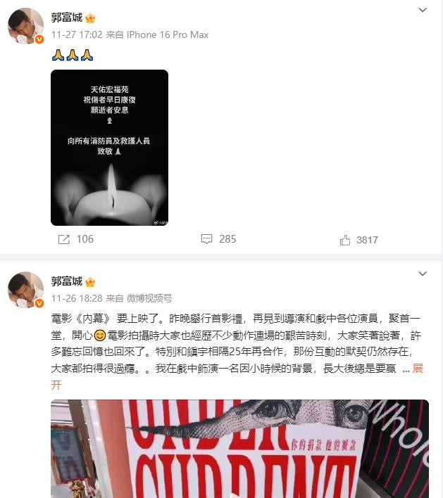 那时,郭富城的新电影《内幕》首映礼刚死心不久,他的微博还在宣传。