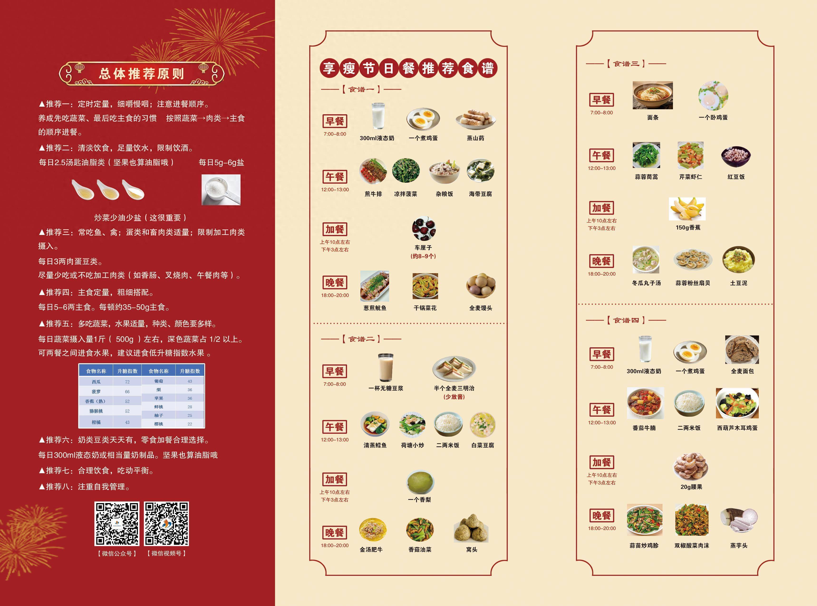“逢年过节,咱们总会收到患者对于‘吃点啥’‘何如吃’的参谋。”杨梅说,这份健康食谱恰是源于日常门诊中多数超重、痴肥及慢病患者的实在需求——很多患者因节日历间饮食失控,导致血糖、血脂、血压难以收尾。食谱围绕“控油、控糖、控乙醇”三大中枢原则制定,兼顾节日饮食的好吃性,既符合体重科罚东谈主群,也适用于有“三高”问题的慢病患者,更能四肢全家的新春健康饮食参考。