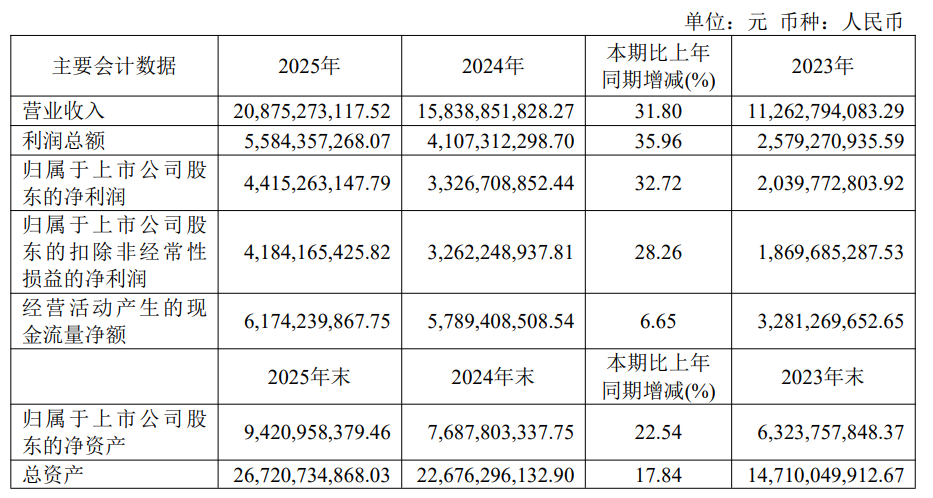 2025年,东鹏饮料营收208.75亿,净利润44.15亿,增速分散为31.80%和32.72%。在当下大环境里其实是还可以的。