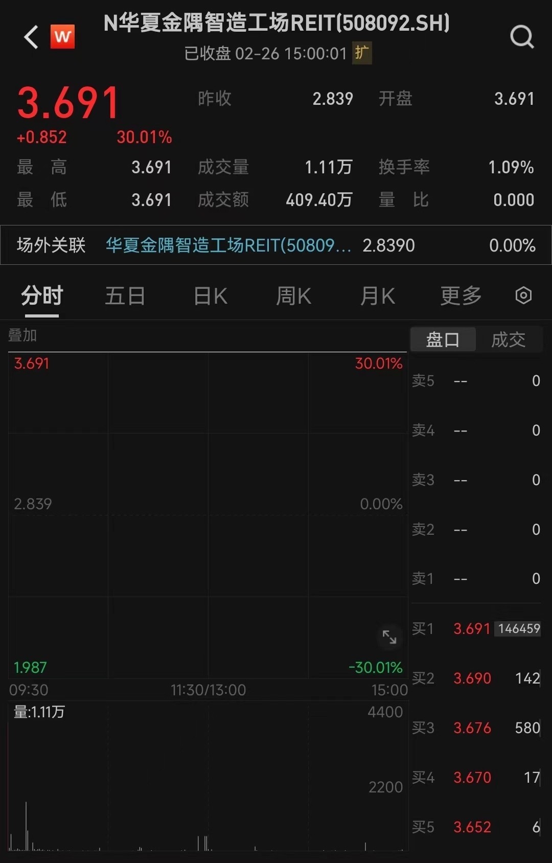 Wind涌现,中原金隅智造工厂REIT上海证券往来所上市往来首日,二级市集的收盘价为3.691元/份,高潮幅度触发当日30%的涨幅限度。