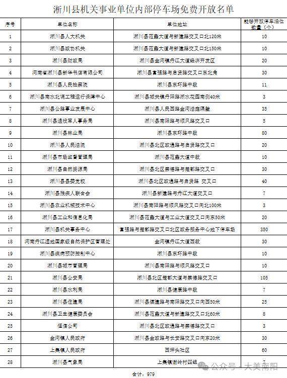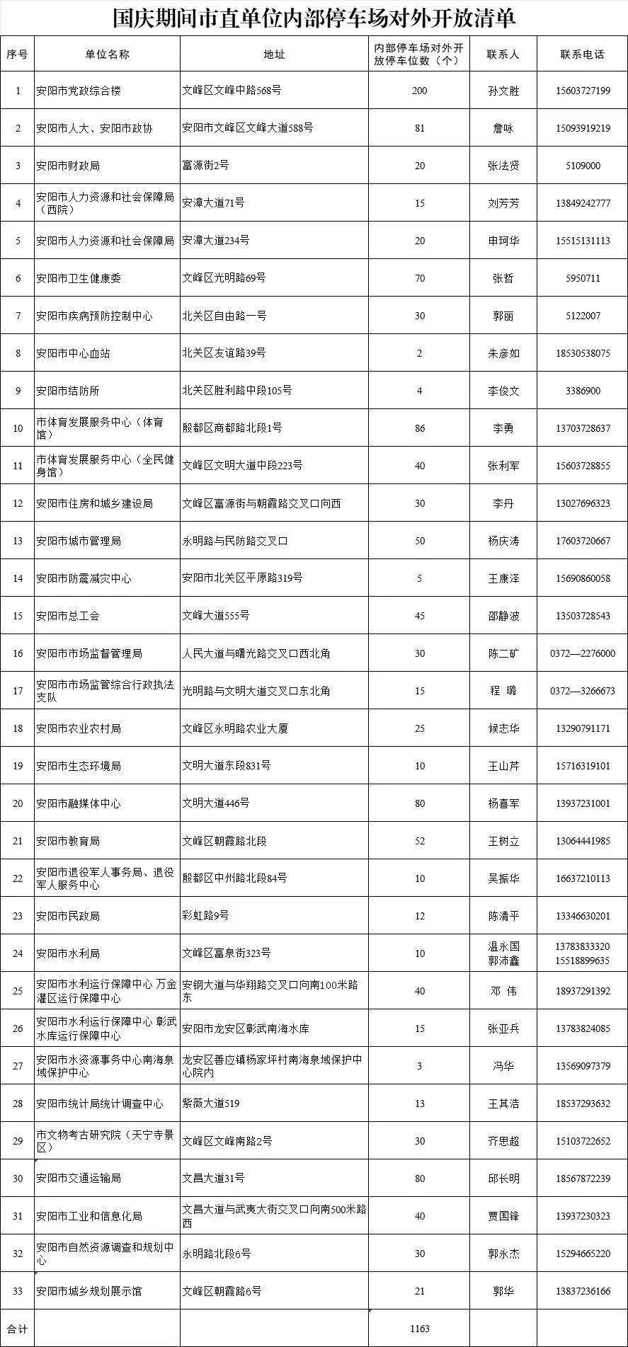 安 阳为处事保险2025年国庆假期外地来安旅客和高大市民民众自驾出行车辆停放,安阳市城市贬责局组织全市各筹办行政机关、企业绩单元、社会团体里面泊车场免费对外洞开。国庆假期共组织全市162家宇宙机构里面泊车场免费对外洞开,洞开泊车位5464个,其中市直单元33家宇宙机构、1163个泊车位,各县(市、区)129家宇宙机构、4301个泊车泊位。市直单元和各县(市、区)宇宙机构里面泊车场洞开清单如下:
