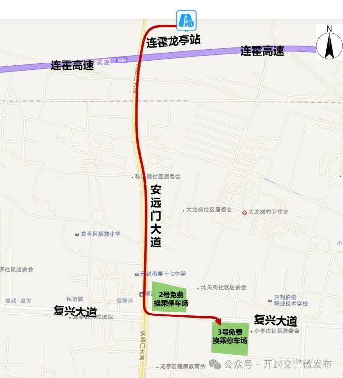 2号免费换乘泊车场默示图3号免费换乘泊车场,位于连霍高速龙亭站向南2000米,安远门正途与回复正途交口左转向东300米路南,提供袖珍车位2000个。从连霍高速龙亭站下站袖珍客车也可在此停放,乘坐免费换乘公贸易返景区。
