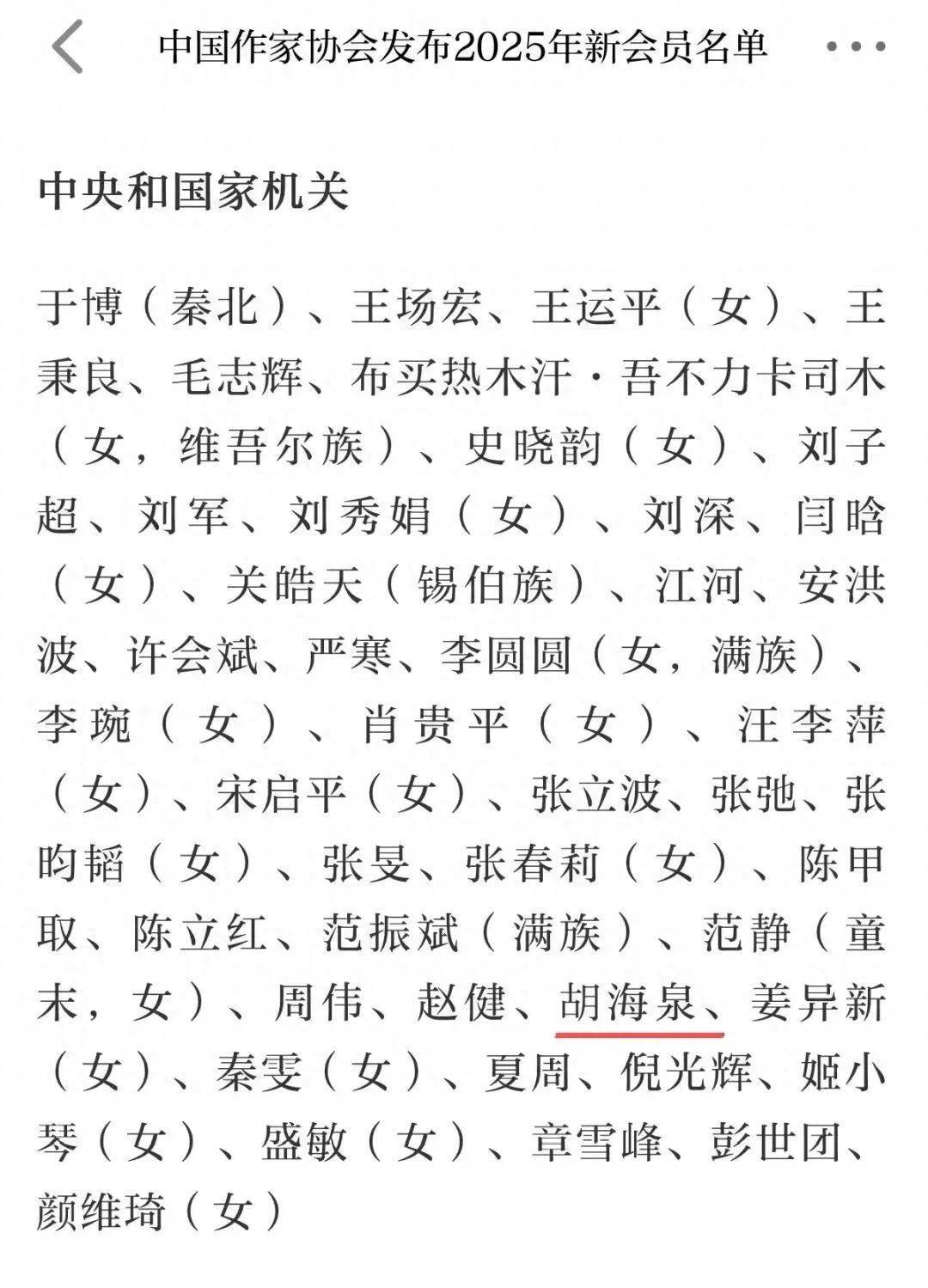 近日,中国作者网公布中国作者协会2025年新会员名单,歌手胡海泉在列。