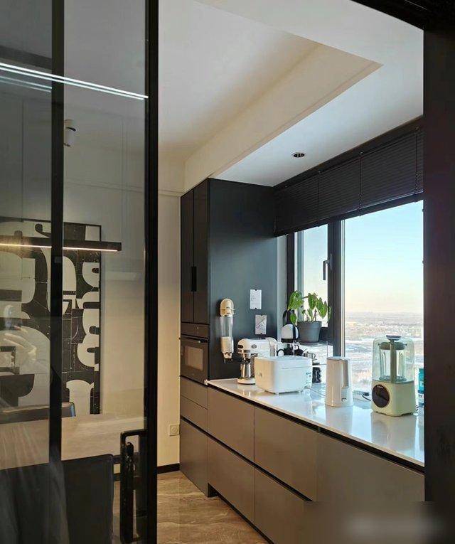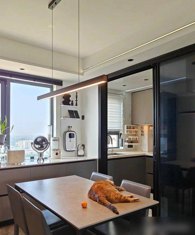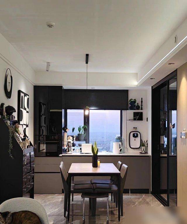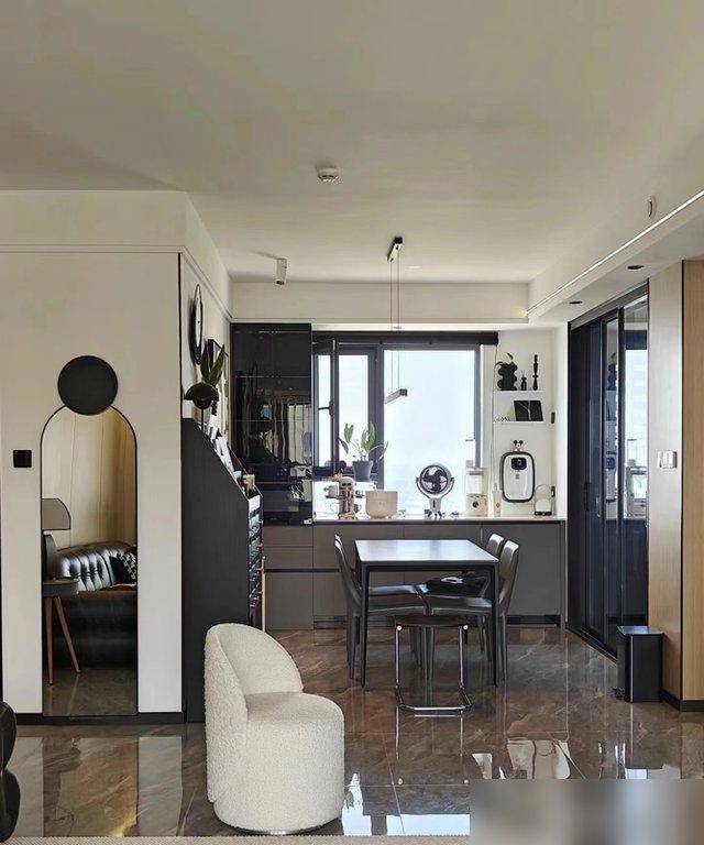 当今许多东说念主装修像“比赛作念柜子”,满墙餐边柜塞得餐厅转不开身,拉椅子齐得侧着身子,东说念主家倒灵巧——把收纳柜挪到窗边,既不挡光还能放碗碟和零食,靠墙摆个小柜子放茶具,再插束刚从菜市集买的向日葵,烟火气里带着点小苟且,这不比占地点的大酒柜高等多了?厨房用黑推拉门离隔来,口角配色永久不外时,过个三五年看,已经像刚装的相通,你说,这是不是“装修的永久之计”?