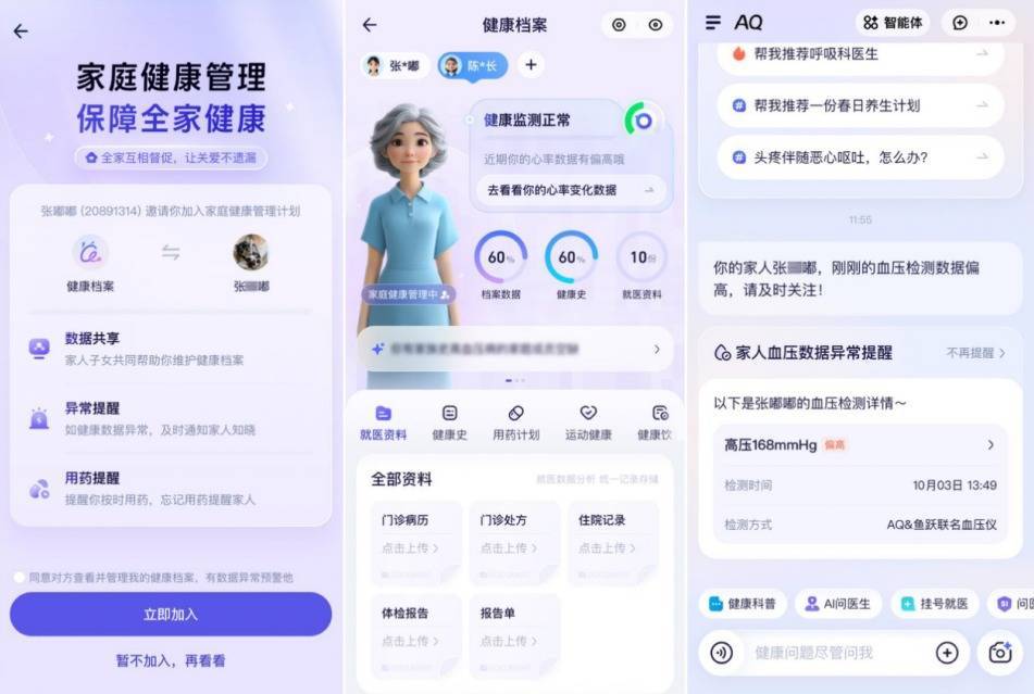 为匡助治理这些问题,围绕老年慢病健康经管,AQ推出了多项功能:拍一拍血压计、血糖仪即可智能解读数据,像大夫能追问,并复古健康数据相等的即时预警;与鱼跃有计划推出AI血压计,可自动同步数据并生成健康周报,便于血压长久管控;推出慢病用药指示功能,父母和子女齐会定时收到奉告,减少忘吃漏吃,幸免病情反复;复古健康档案分享给家东谈主,父母的病历和体检叙述,子女随时能看、能管、能指示。通逾期刻让子女即使身处他乡,也能为父母的健康筑起“留神网”,让重阳节的和顺不啻于节日,更融入普通慢病经管的每一个细节。