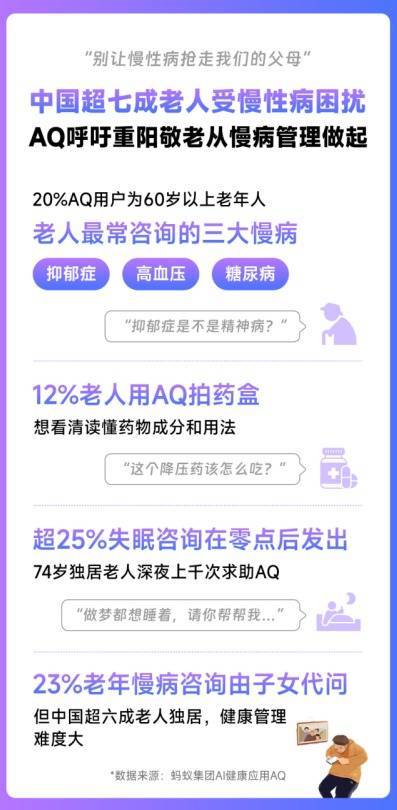 10月27日,AQ败露的一组数据折射出老年群体的真正逆境:60岁以上老东谈主占其用户总和近20%;12%的老东谈主会用AQ拍摄药盒,但愿看懂药物身分和用法;老东谈主们也分解过语音反复参议慢病照看学问,从“冠心病醒目事项”到“糖尿病饮食指南”……他们既为体魄不适担忧,也亟须更多有用的匡助,比如在偶尔漏吃药或忘测血压的时代给以指示。